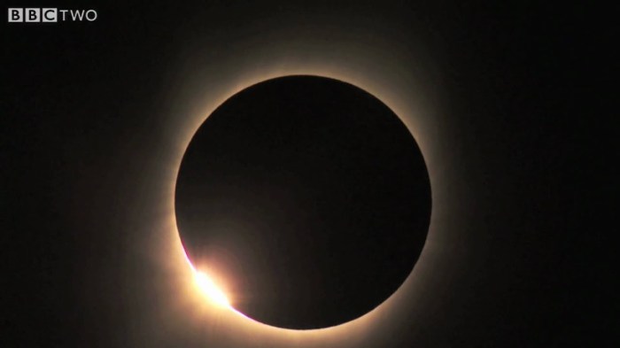 “Consider that the sun is about 400 times the diameter of the moon, which would make it awfully hard for the lunar disk to fit so perfectly over the solar one—except that the sun is also about 400 times more distant, meaning that the two bodies appear to be the same size in the earthly sky. Consider the way the moon’s ragged mountains, which are impossible to see from as far away as Earth, form a sawtooth pattern at the lunar edges through which the last of the sun’s light streams in the moments before a total eclipse is complete, creating the brilliant burst of light astronomers call the diamond ring effect.” (http://time.com/4829265/total-solar-eclipse-beauty-science/)