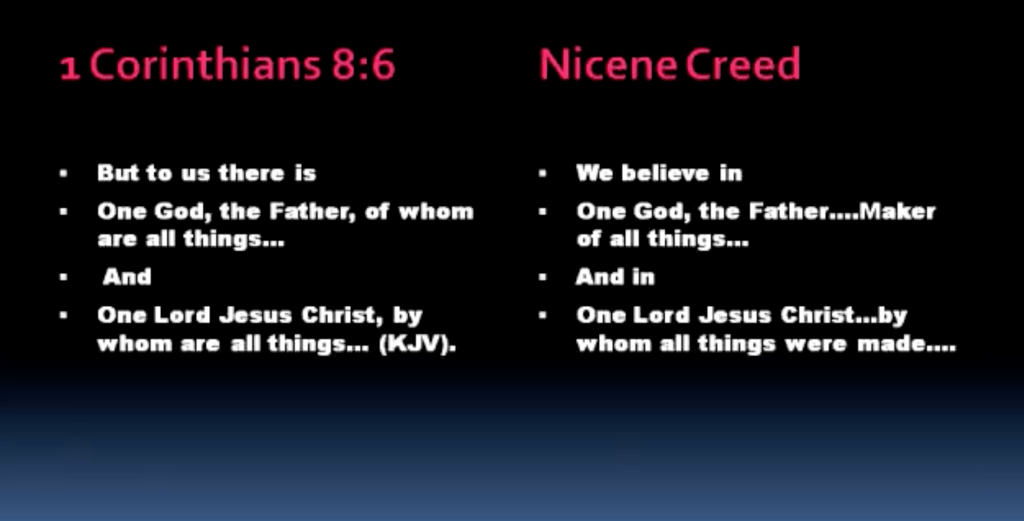 Before I proceed, I’d like to draw your attention to the fact that these two articles both echo the language and content of 1 Corinthians 8:6. Unless otherwise noted, all my quotations come from the King James Version since that is the Mormons’ official version. You see here: “But to us, there is one God, the Father, of whom are all things, and one Lord Jesus Christ, by whom are all things.” And we have this one God, one Lord thing going on in the Nicene Creed as well.