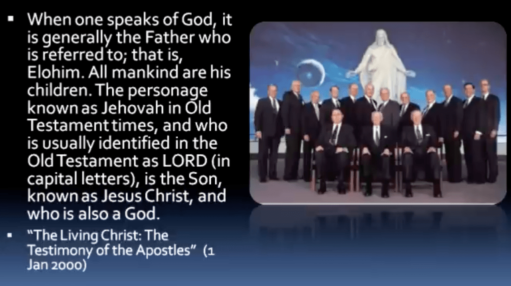 “When one speaks of God, it is generally the Father who is referred to; that is, Elohim. All mankind are His children. The personage known as Jehovah in Old Testament times, and who is usually identified in the Old Testament as ‘LORD’ (in capital letters) [if you have ever looked at your Bible and wondered why ‘LORD’ was sometimes capitalized and sometimes not, that’s why, and it goes back to the King James at least], is the Son known as Jesus Christ, who is also a God.”