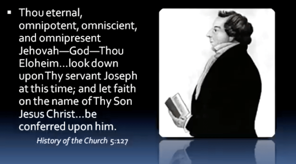“Thou eternal, omnipotent, omniscient, and omnipresent Jehovah—God—Thou Eloheim… look down upon Thy servant Joseph at this time; and let faith on the name of Thy Son Jesus Christ… be conferred upon him.”