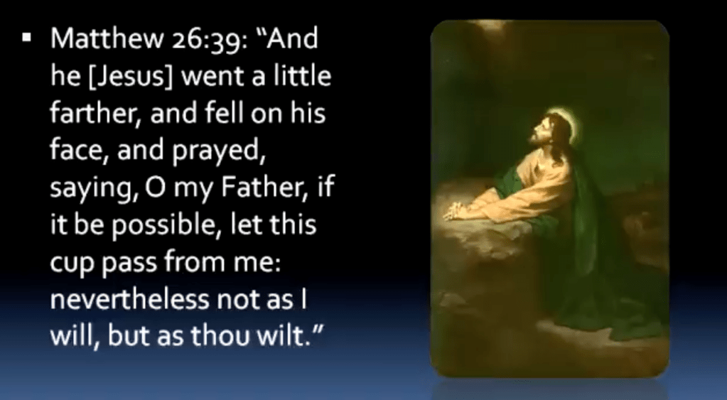 The most important passage in this regard relates to the Garden of Gethsemane, where, as an example, in Matthew 26:39, Jesus falls on his face and prays, “Father, if it is possible, let this cup of death pass from me, but not my will, but your will be done.” This shows not only that the Father and the Son have different wills, but also that the Son is submitting his will to his Father.