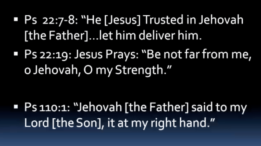 Once we understand that Psalm 22 is a prophetic description of the suffering of Jesus, we are able to see other things that are helpful as well. The New Testament tells us that Jesus was mocked as he hung on the cross. These mockers appear in Psalm 22:7-8, and what do they say? “He trusted in Jehovah” (you’ll see “LORD” in capital letters in your Bibles), “let [Jehovah] deliver him.” Then in Psalm 22:19, in case those guys got it wrong, Jesus himself prays, “Be not far from me, O Jehovah, O my strength, haste to help me.” In this passage, then, Jesus is not Jehovah; the Father is.